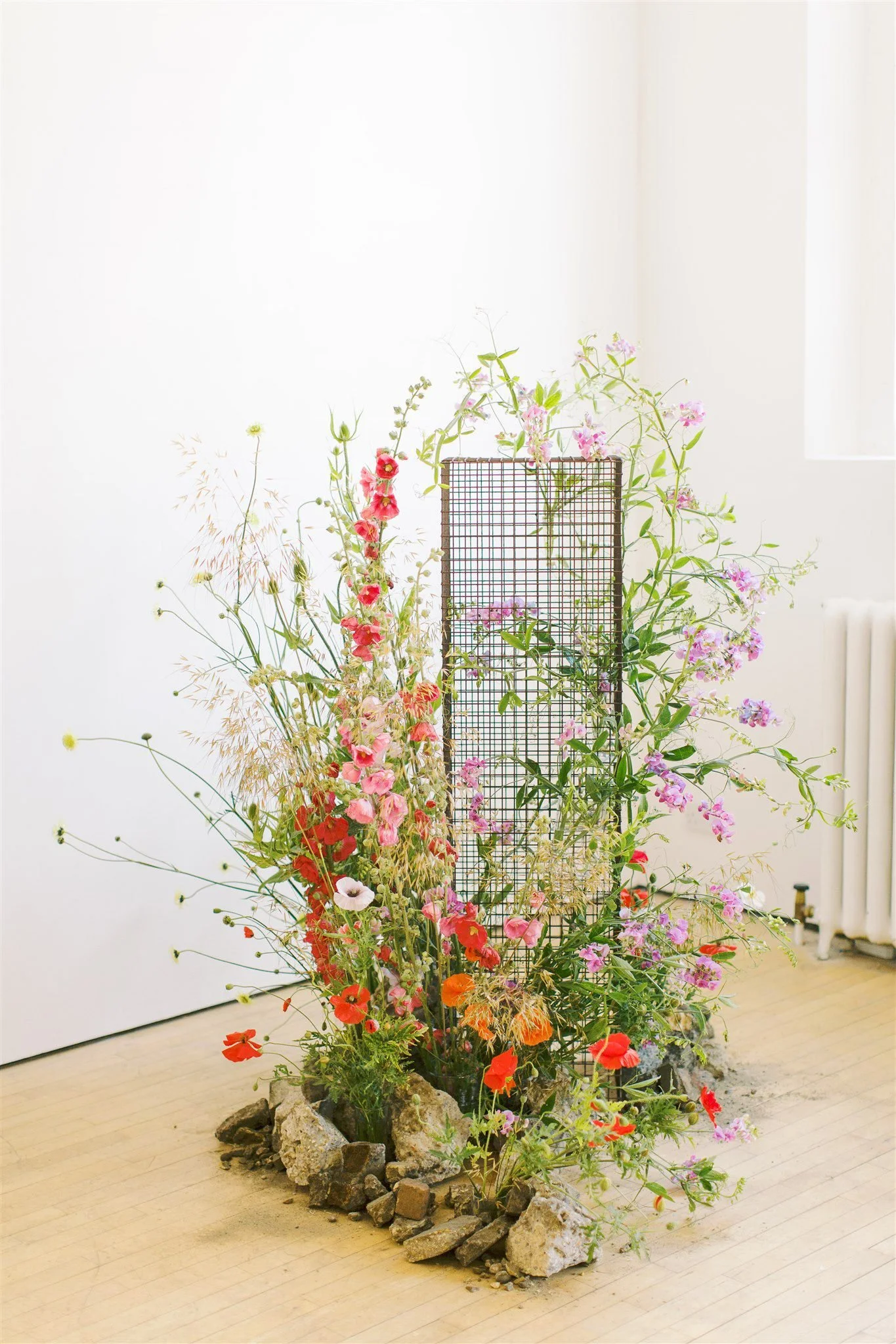 Her installation for Flowers on the Edge began with two things: a rusted wire cage she’d found years ago, and everlasting sweet peas one of her favourite June flowers, known for their soft colour and wild, climbing growth. But as she began designing, the piece evolved into something more.
